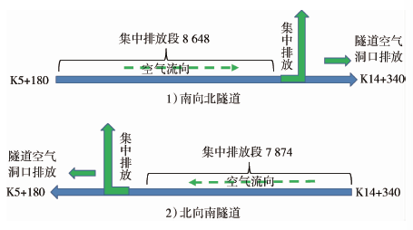 图4 分段纵向通风方式十隧道中部集中排放示意图(m)